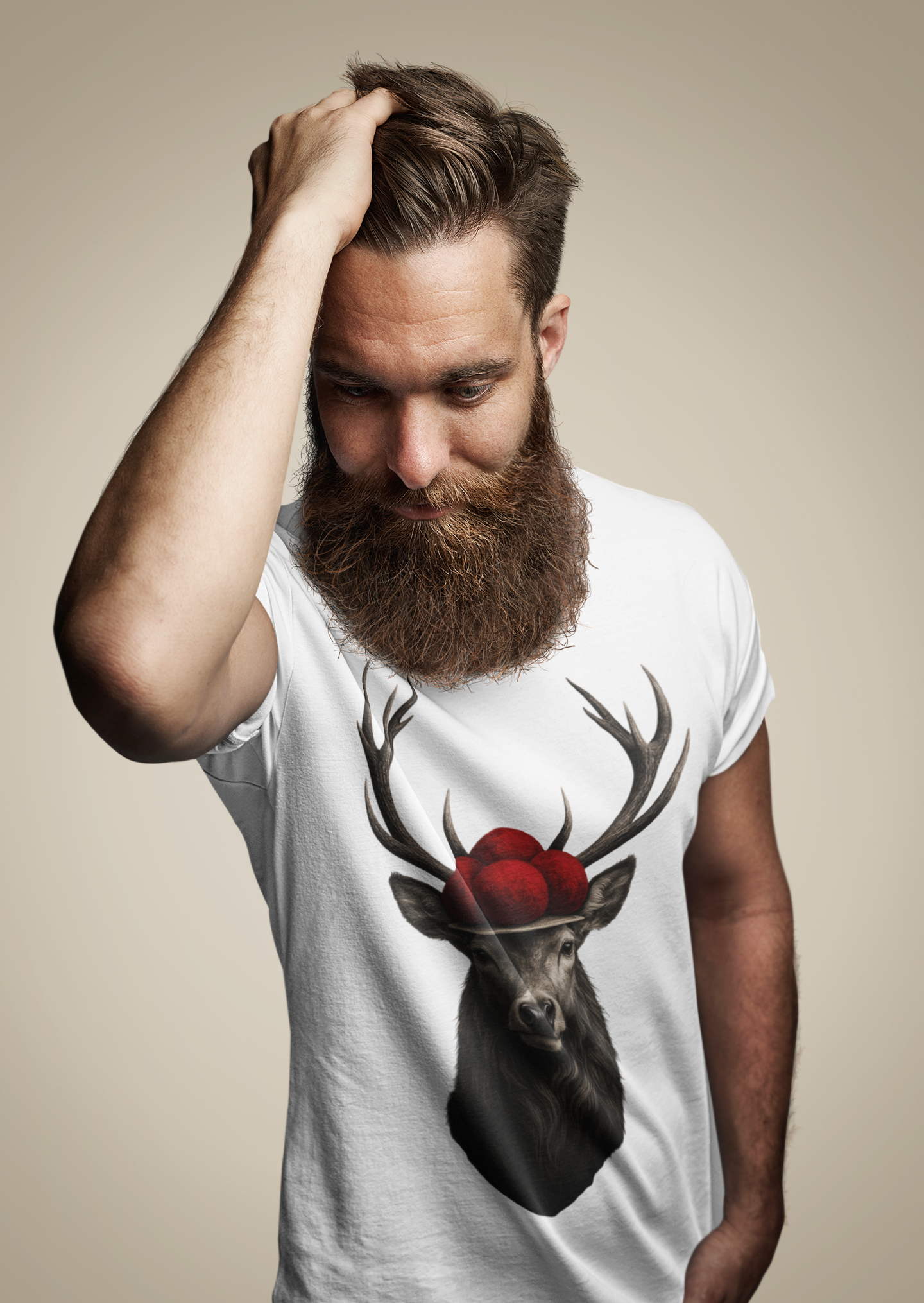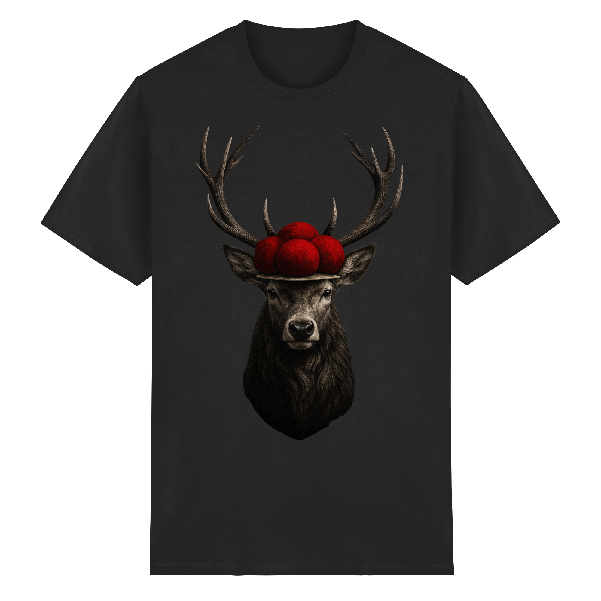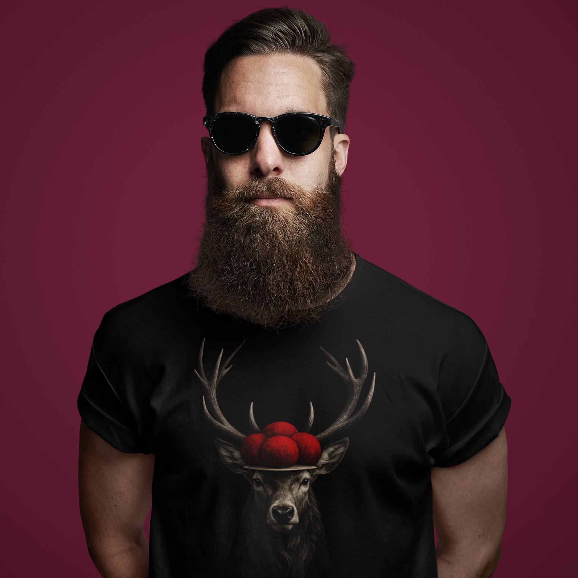 Dieser detaillierte Schwarzwald-Hirsch kombiniert elegante Naturästhetik mit modernem, urbanem Winter-Vibe. Der tiefschwarze Hirschkopf trifft auf rote Akzentkugeln – ein markantes Luxusdetail, das sofort ins Auge fällt.